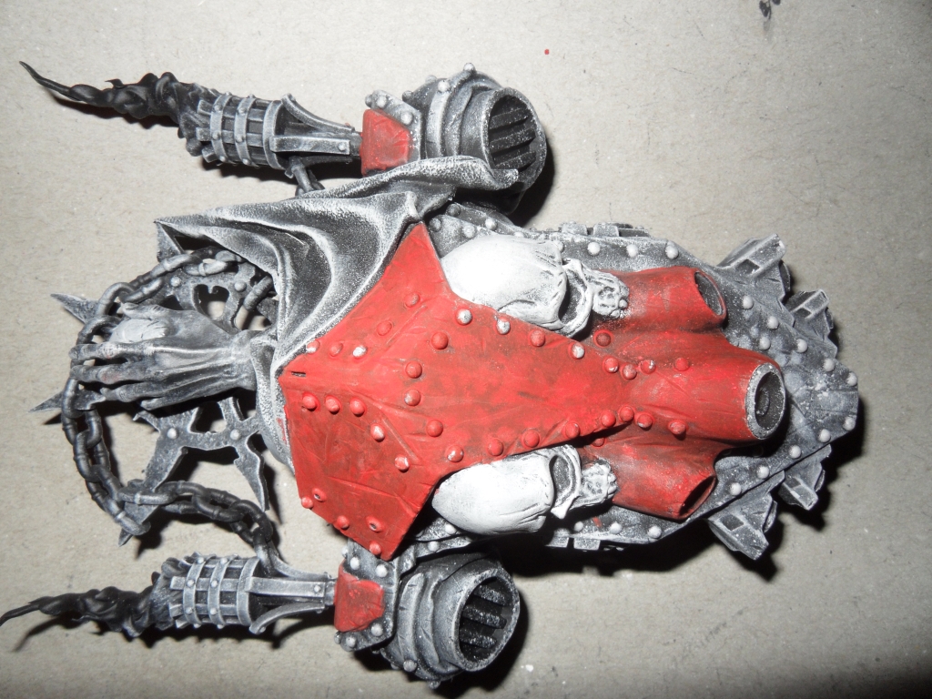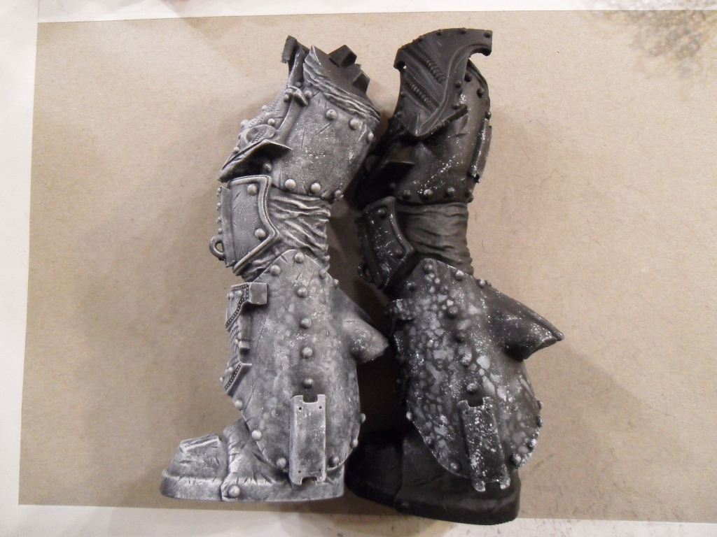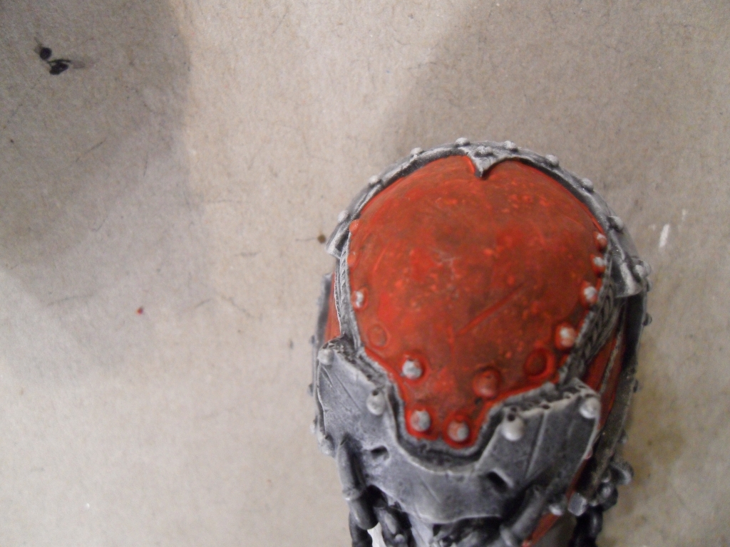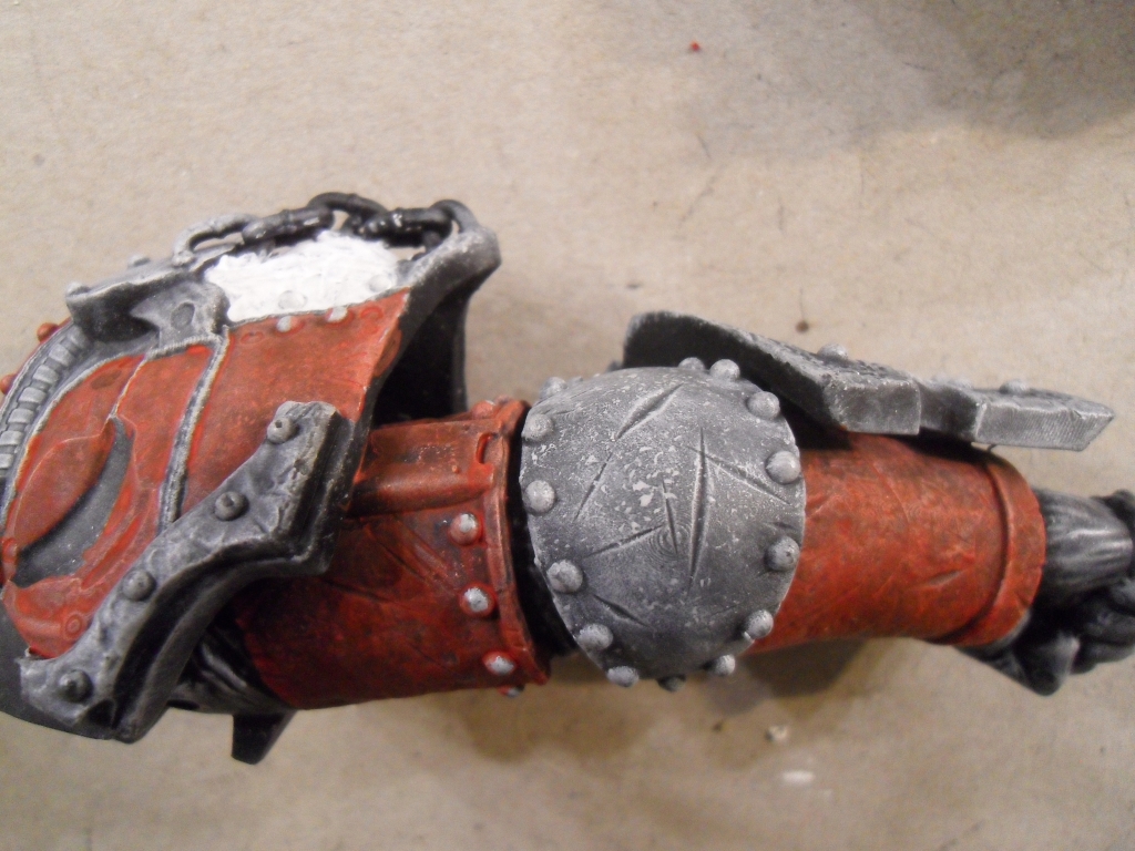 – Mit einer Airbrush-Schablone und mattem Weiß Flecken auf die Rüstung gesprüht, um eine lebendigere Deckfarbe zu ermöglichen